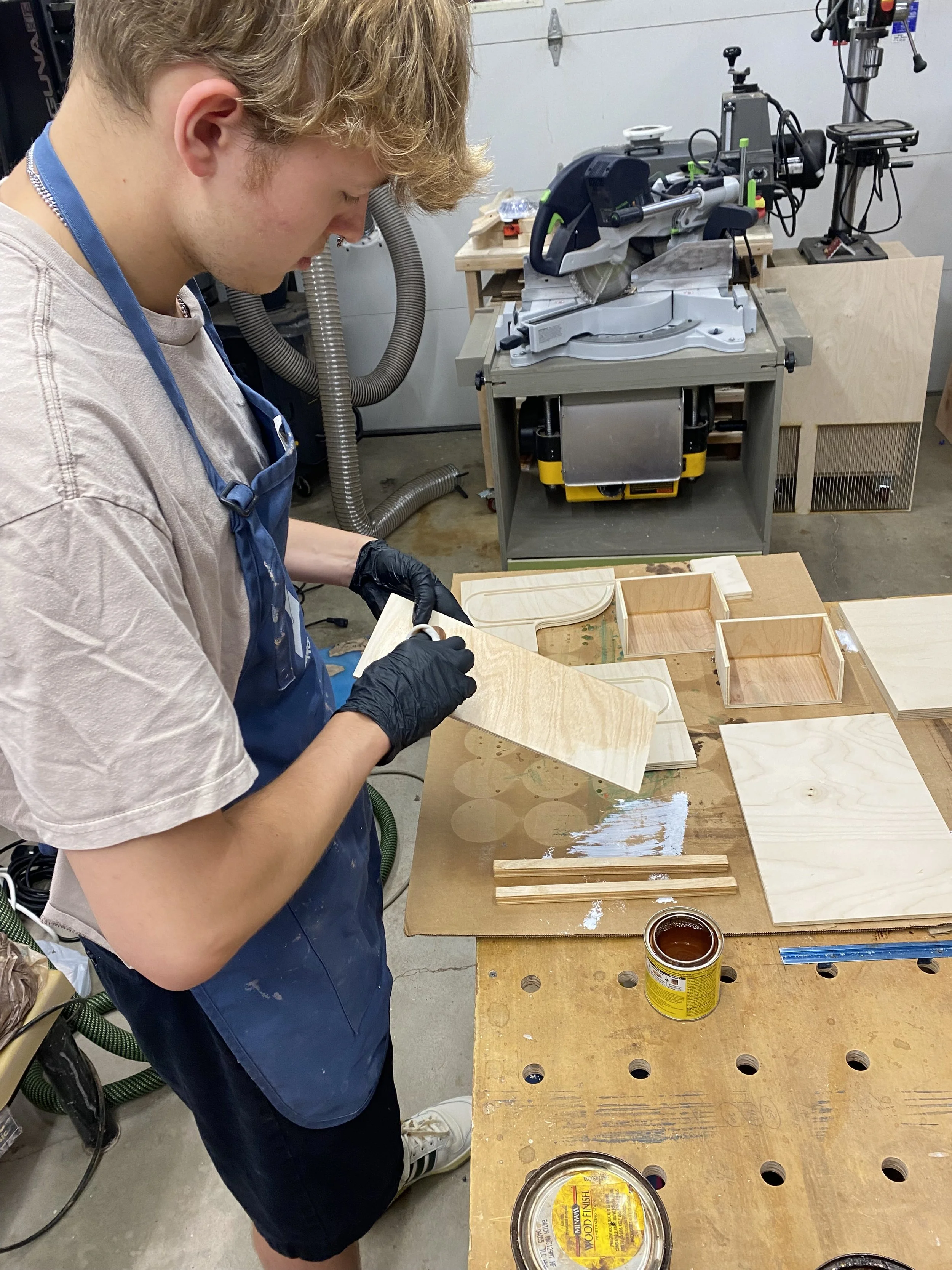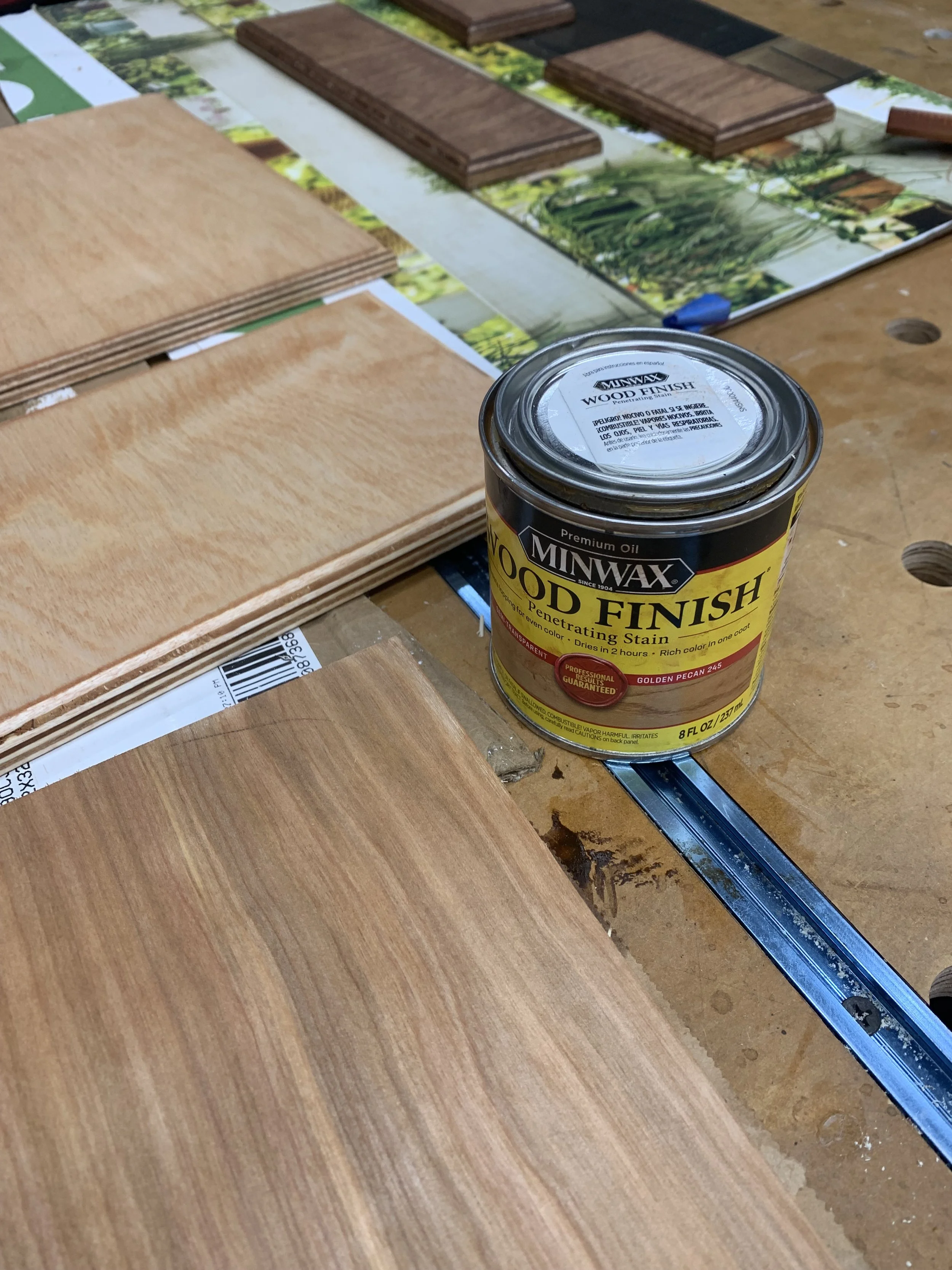 After all pieces are cut out, they are then stained with two different shades of wood stain, and then dried and assembled.