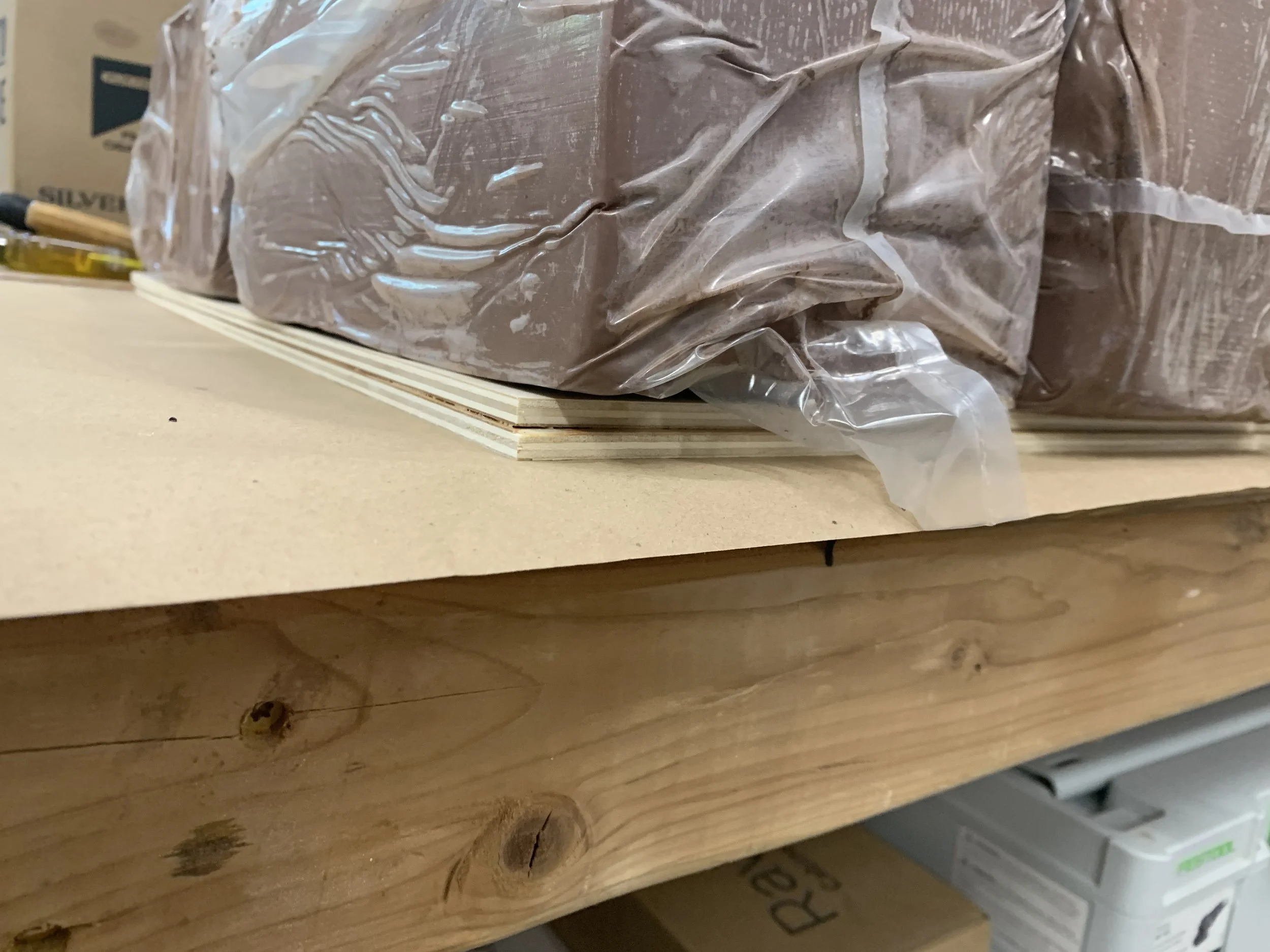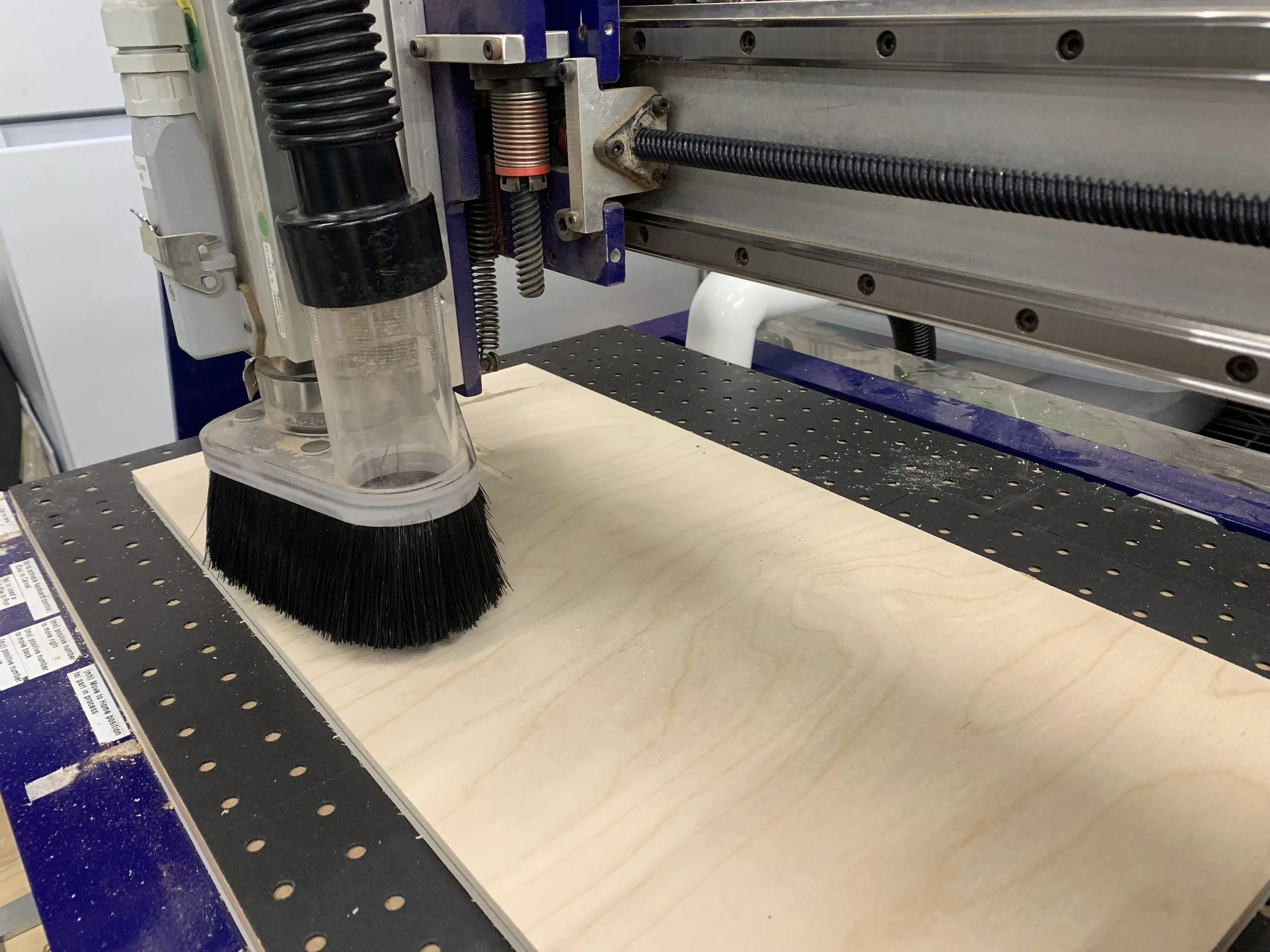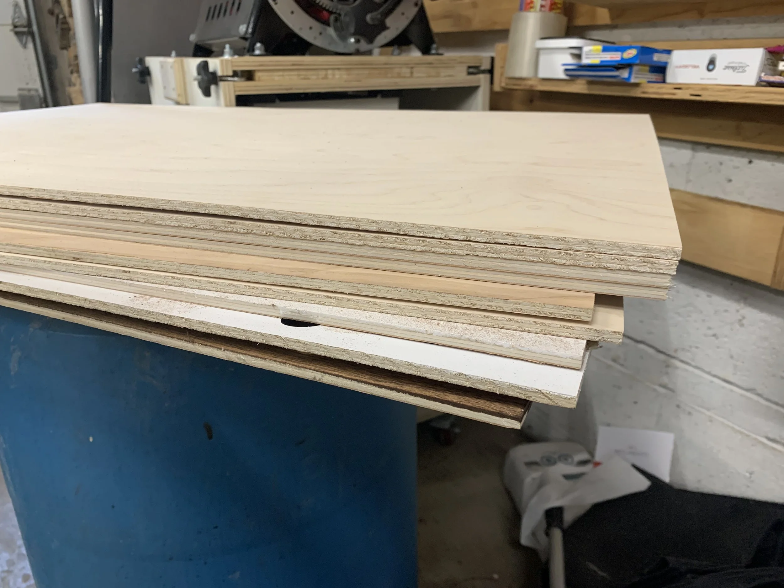 Plywood boards are glued together to create half-inch pieces from originally quarter inch boards. The parts are then cut out on a router, in order to allow for accurate, precise cuts that allow for snug assembly.