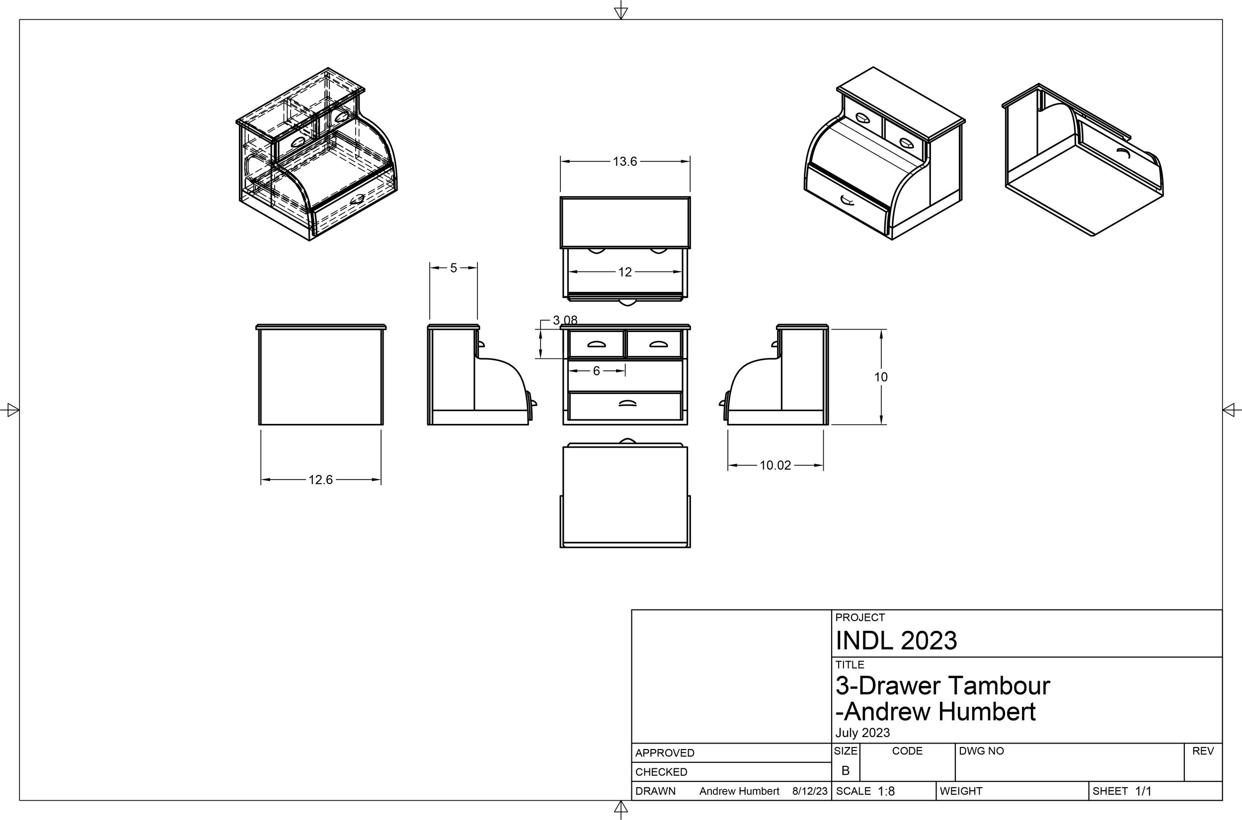 This is a sketch layout of different orthographic / isometric views of the box, to better understand dimensions and interiors.