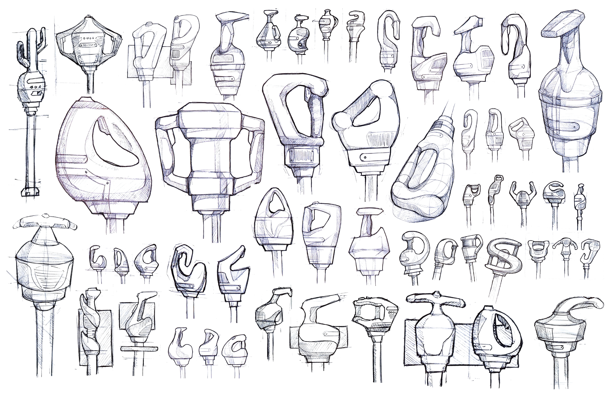 Various handle formations are sketched in order to see which one best fits brand language, with some formations using either one hand or both.