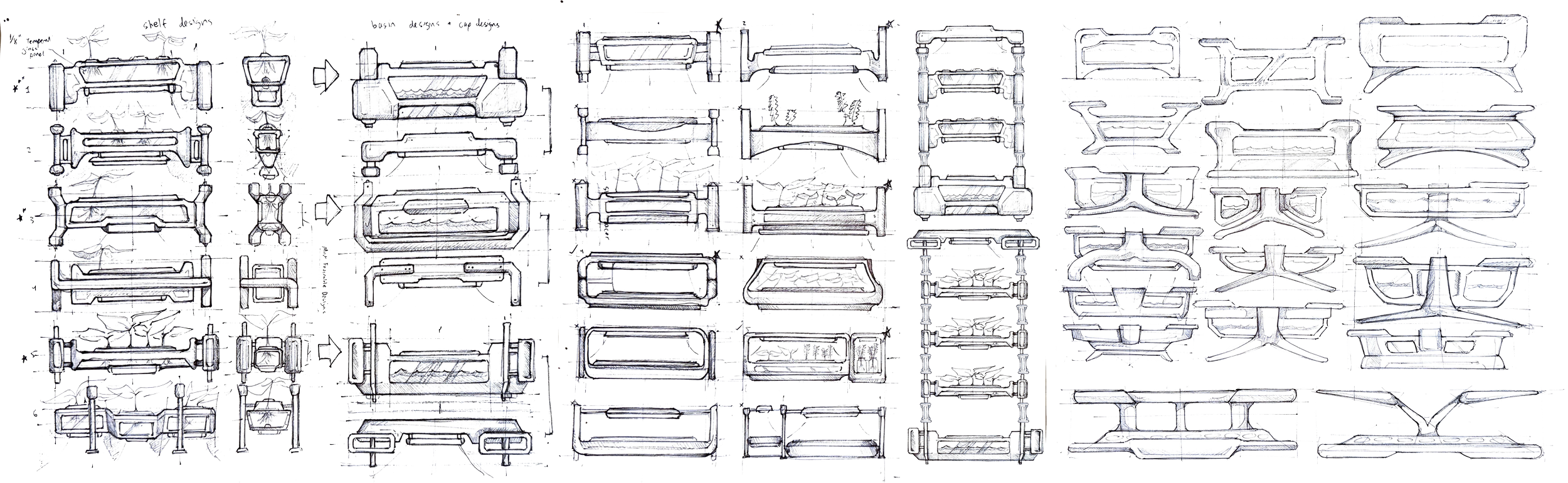Design started more boxy, modular, exterior posts, no main basin design yet. Moved in a direction of less material, in turn would be more sustainable with less material. Wanted to go with more natural shape, less utilitarian, follow something with more flow. Ended up with plantlike design, branch supports, leafy structures, user friendly