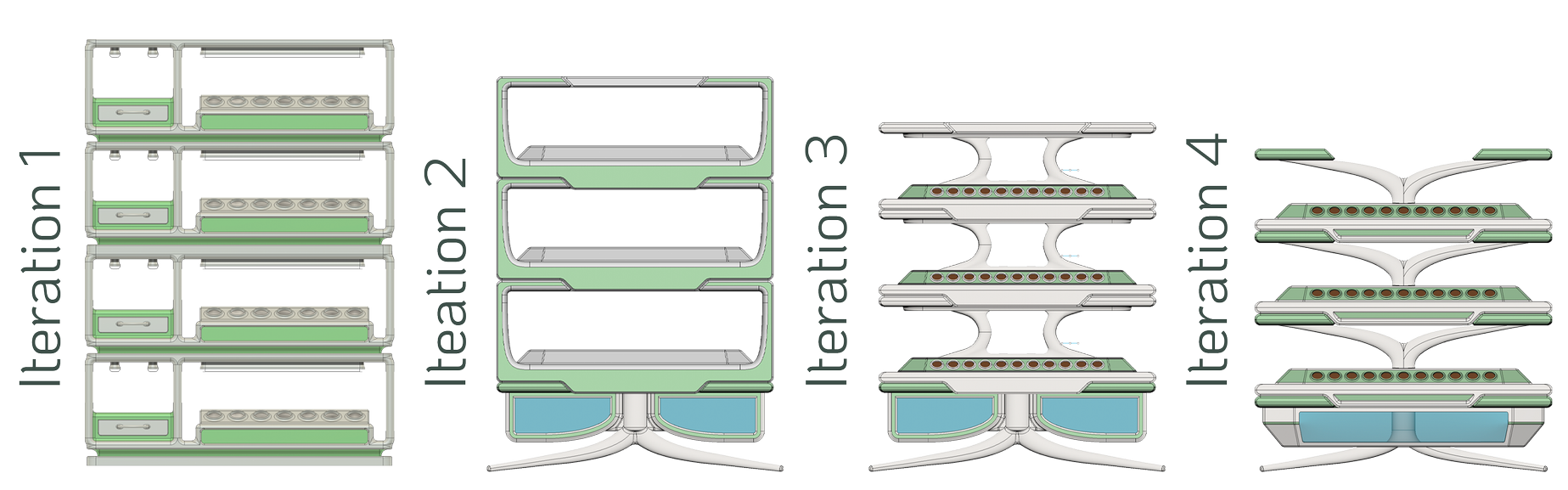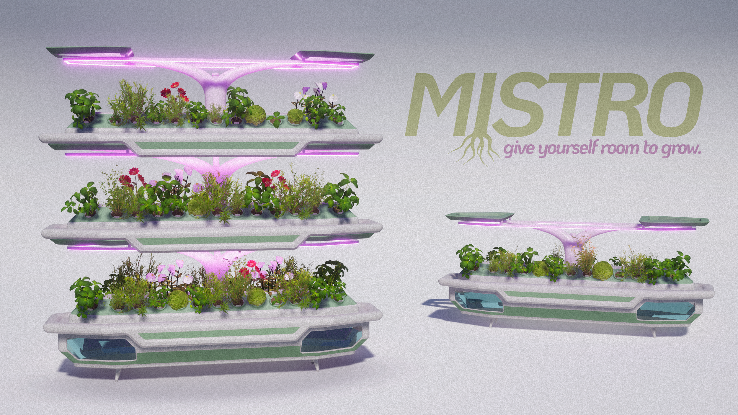 Final renders are created by taking inspiration from real life plants that would be normally used in an aeroponic garden. Cut sections are shown to reveal mechanics inside the garden, including the water pump system and the planting cups placements.